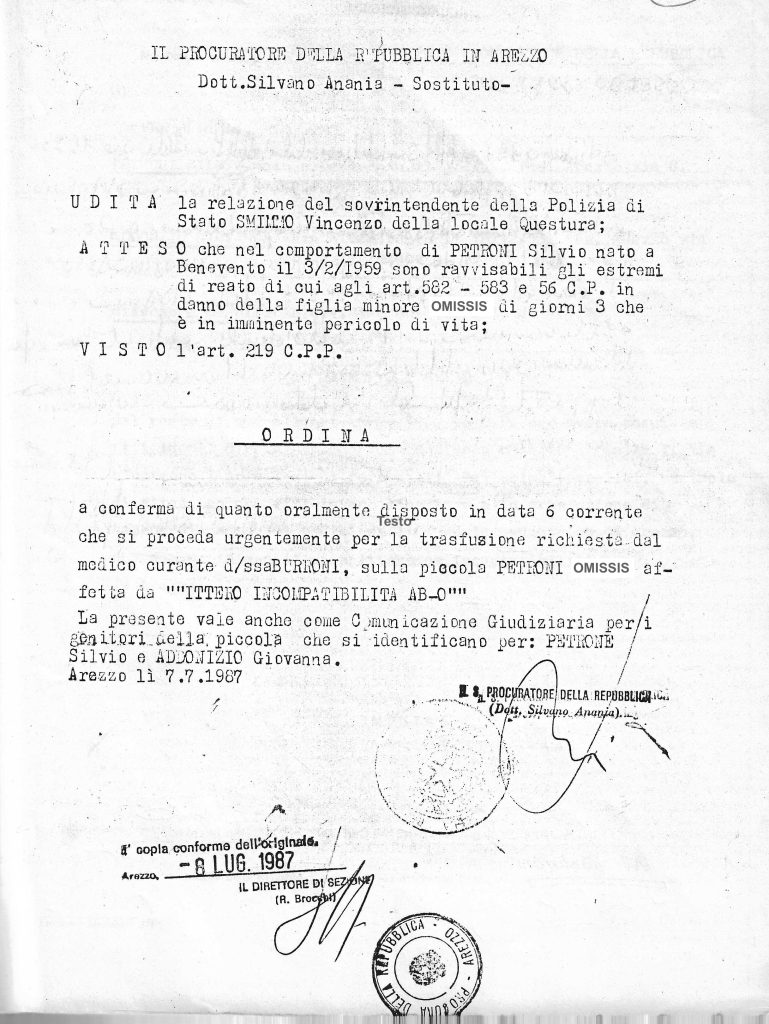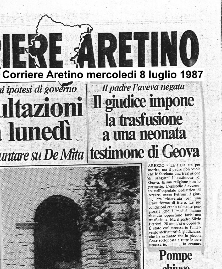 “Giudice salva una neonata. Il padre impediva la trasfusione di sangue” – La Nazione, 8 luglio 1987” – “Neonata in fin di vita – Il padre si oppone ad una trasfusione” – Corriere Aretino, 8 luglio 1987 – “Nei guai il Padre di (xxxxx) – Si era opposto a una trasfusione di sangue” – La Nazione 10 luglio 1987 – “Rifiuta una trasfusione alla figlia incriminato” – Corriere Aretino 10 luglio 1987 – Questi i titoli dei quotidiani che commentarono l’episodio accaduto ad Arezzo il 6 luglio 1987 presso l’Ospedale Pediatrico. Quali i fatti e le persone? Sentiamo nell’intervista la loro versione che riferirono al Sostituto Procuratore Dott. Silvano Anania, a cui è doveroso riconoscergli che ebbe il coraggio di proscioglierli dopo nove mesi, andando contro la sua stessa decisione di incriminarli.