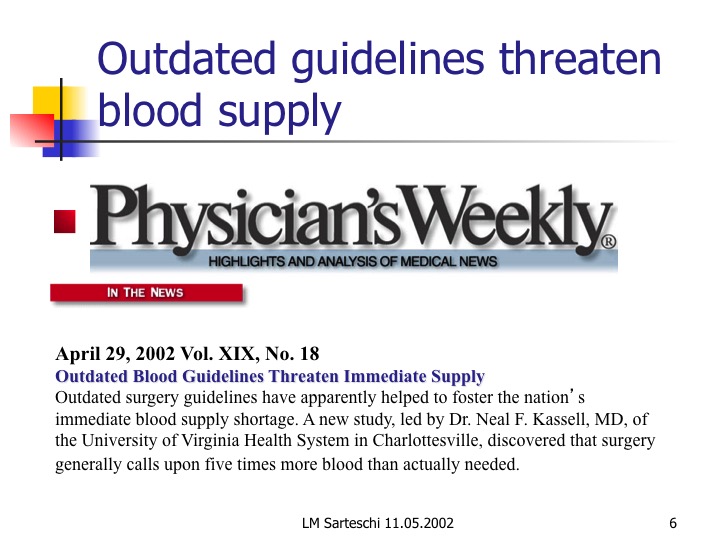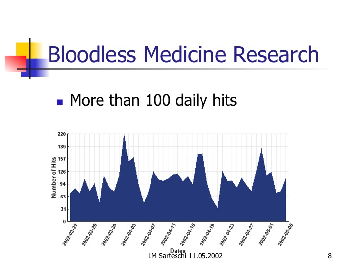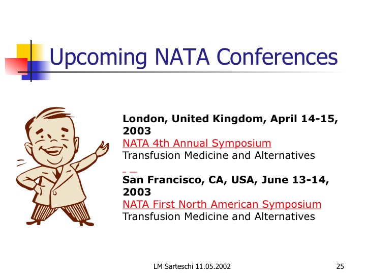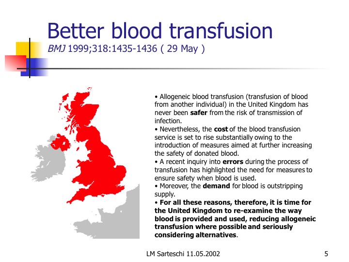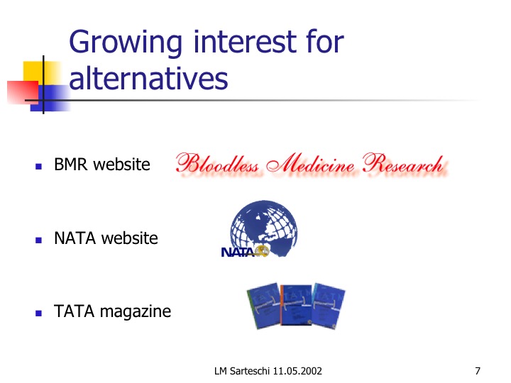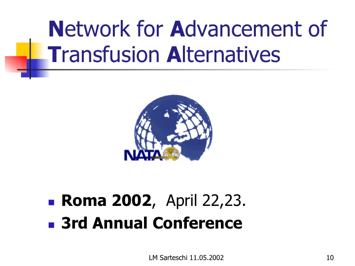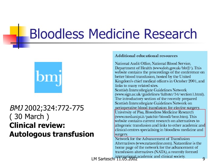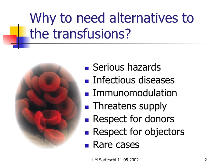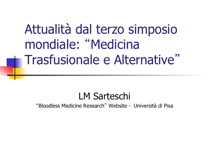 10:35 Dott. L.M. Sarteschi – Curatore del sito Bloodless Medicine Research – Università di Pisa: ” Attualità da 3° Simposio Mondiale ‘Medicina trasfusionale e Alternative”