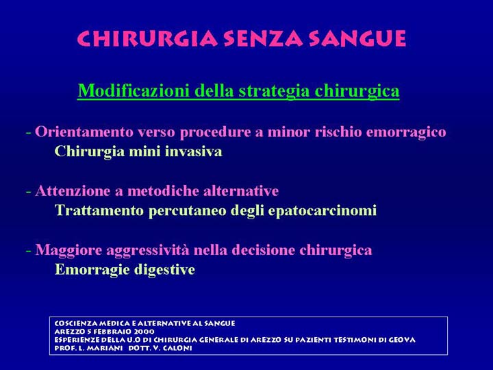 Ogni gruppo chirurgico si è quindi dovuto confrontare con queste nuove esigenze, indipendentemente dai problemi religiosi di rifiuto delle emotrasfusioni; è tuttavia evidente che questa particolare categoria di pazienti ha spesso costituito lo stimolo ad adottare procedure o metodiche alternative altrimenti in discussione, che l’esperienza ha poi dimostrato avere favorevoli risultati; l’esempio più clamoroso è stato il “priming” dei circuiti di C.E.C. con destrosio, adottato da Cooley per i Testimoni di Geova fin dalla fine degli anni ‘60 e poi divenuto procedura routinaria per tutti. Una “chirurgia senza sangue”, o tendente comunque al minor uso possibile di emotrasfusioni, ci ha dunque progressivamente indotto a modificare in molti campi strategie e tecniche chirurgiche.