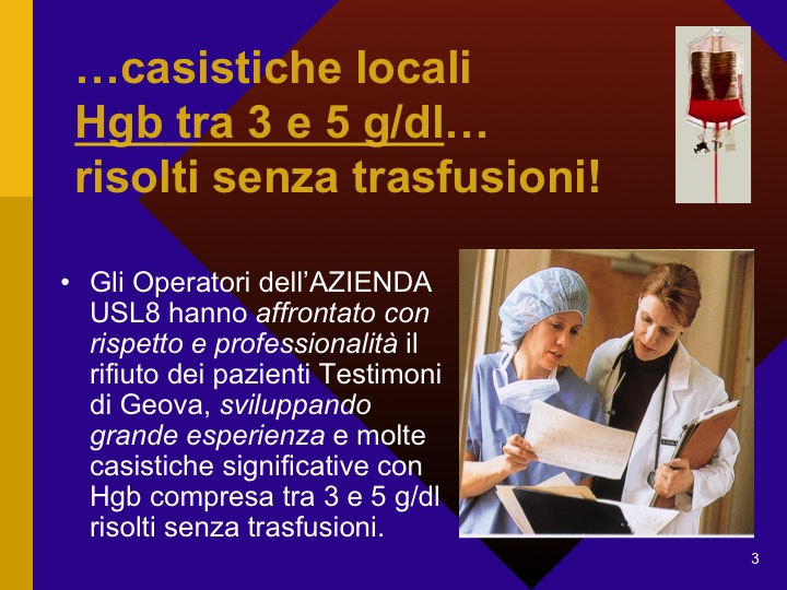 Uno speciale ringraziamento è dovuto al Comitato Etico Locale USL8 di Arezzo che in piena collaborazione con il locale Comitato di Assistenza Sanitaria e all’Hospital Information Service della sede Mondiale dei Testimoni di Geova per la diffusione di tutte le informazioni Scientifiche ed Etiche Internazionali utili per abbattere anche qui in Italia barriere e pregiudizi Culturali Secolari. A distanza di anni ad Arezzo si è dato il via alle attuali leggi per i diritti del rifiuto di terapie salvavita o interruzioni di accanimenti terapeutici. State per osservare la storia dei BioDiritti in Italia. Un grazie al sig. Giuseppe Baldini e al Suo Staff per la videoregistrazione e cura acustica degli eventi.