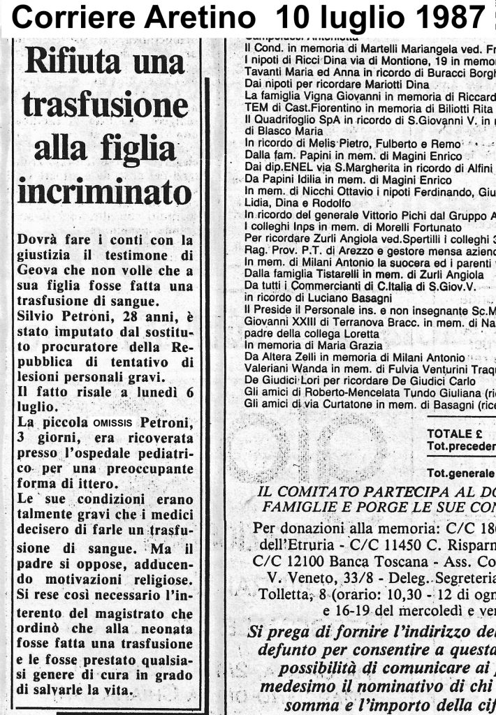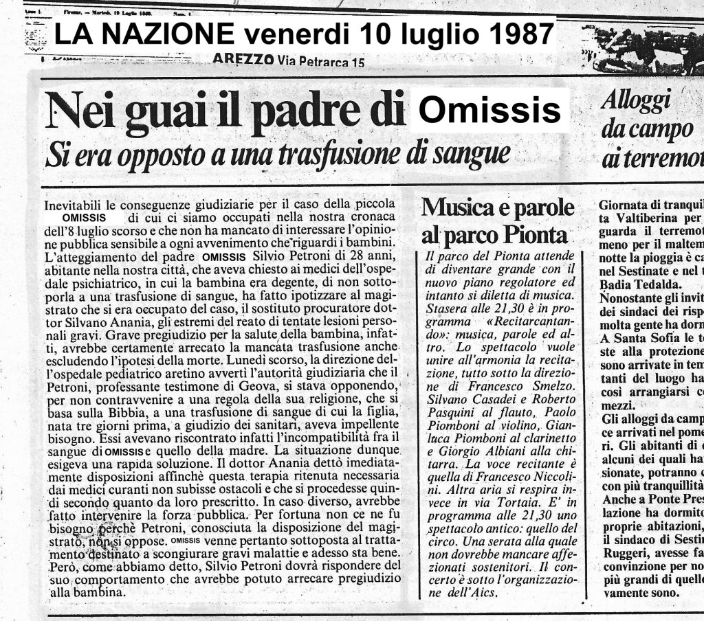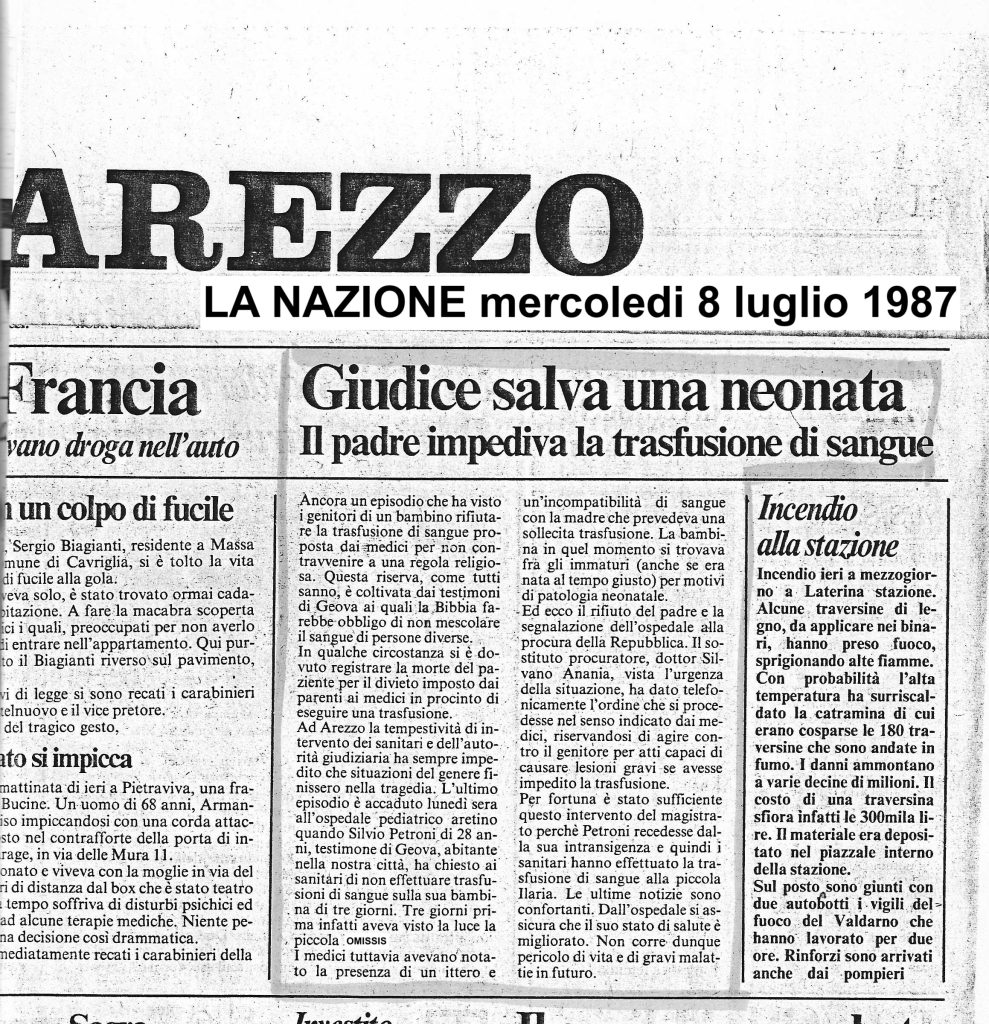 “Giudice salva una neonata. Il padre impediva la trasfusione di sangue” – La Nazione, 8 luglio 1987” – “Neonata in fin di vita – Il padre si oppone ad una trasfusione” – Corriere Aretino, 8 luglio 1987 – “Nei guai il Padre di (xxxxx) – Si era opposto a una trasfusione di sangue” – La Nazione 10 luglio 1987 – “Rifiuta una trasfusione alla figlia incriminato” – Corriere Aretino 10 luglio 1987 – Questi i titoli dei quotidiani che commentarono l’episodio accaduto ad Arezzo il 6 luglio 1987 presso l’Ospedale Pediatrico. Quali i fatti e le persone? Sentiamo nell’intervista la loro versione che riferirono al Sostituto Procuratore Dott. Silvano Anania, a cui è doveroso riconoscergli che ebbe il coraggio di proscioglierli dopo nove mesi, andando contro la sua stessa decisione di incriminarli.