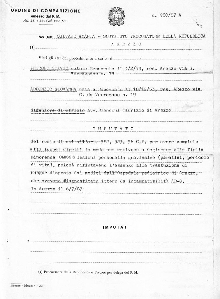 Biodiritti.org: Dalle carte processuali risulta che l’ospedale Pediatrico segnalò immediatamente il caso alla Procura della Repubblica e il sostituto Procuratore dott. Silvano Anania, ordinò telefonicamente di trasfondere, aprendo il procedimento penale a carico di entrambi i coniugi, imputati del reato di cui agli articoli 582, 583, 56 c.p. per avere compiuto atti idonei diretti in modo non equivoco a causare alla figlia minorenne (omissis) lesioni personali, gravissime (paralisi, pericolo di vita) … poiché rifiutavano l’assenso alle trasfusioni di sangue. (Leggete qui in Gazzetta ufficiale gli anni di pena detentiva per il delitto di lesioni tentate Art. 56 Codice Penale). I coniugi Petrone vennero formalmente prosciolti in sede istruttoria, il 16 aprile 1988, nove mesi dopo la prolungata gogna mediatica.